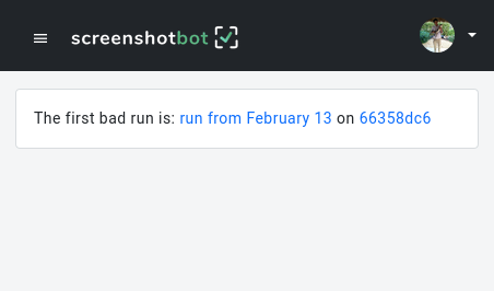 Keep in mind that Screenshotbot can only tell you the first commit that introduced the bad screenshots. In certain situations, this might not correspond to the actual blame commit (for example, if the build was broken on the blame commit). But even in those cases it's usually sufficient to look at a few ancestor commits to find the blame.