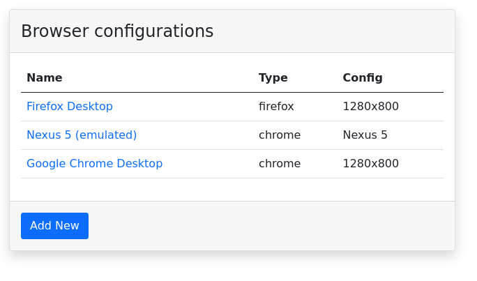 Notice that in the previous set up, we pre-populate three browser configurations for you: Firefox, Google Chrome, and Nexus 5. The Nexus 5 uses Chrome's mobile emulation mode.